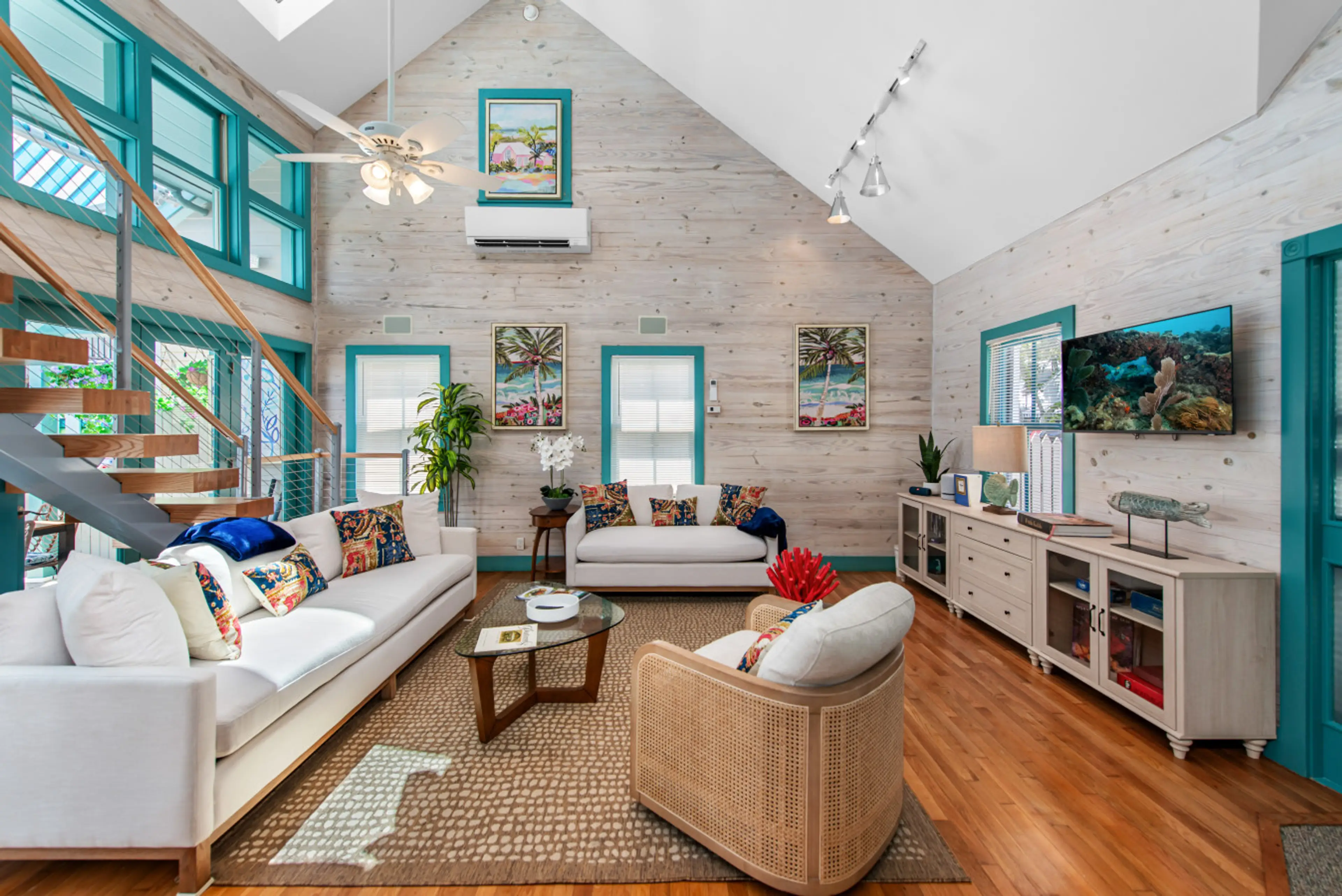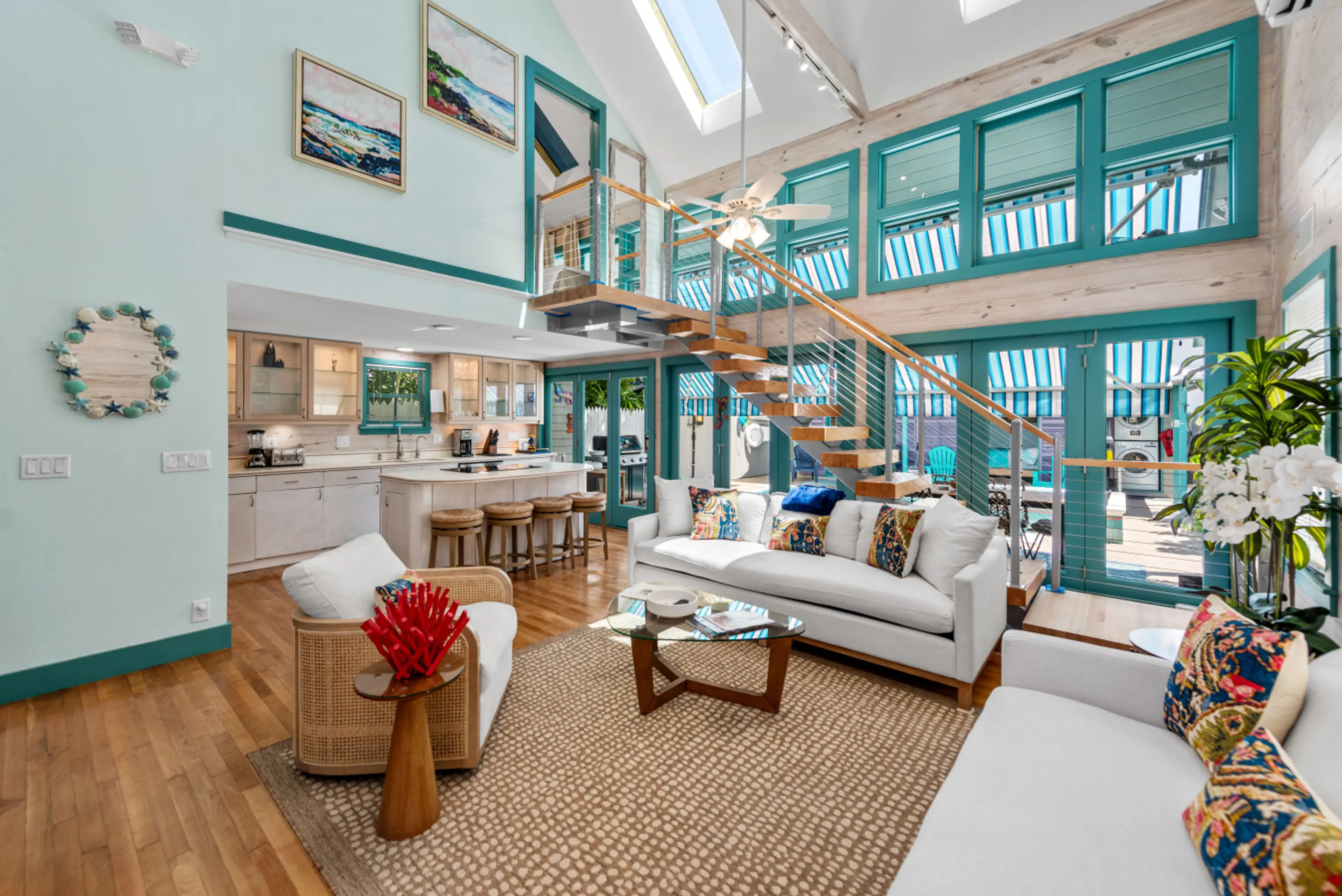 Just added to Center Court, June, 2025, be among the first to stay in this unique, stunning, architect designed home built in the 1990's which has been lovingly restored. This is a unique 2-part home with the front building consisting of the living room with soaring 2 story ceilings and skylights, ...